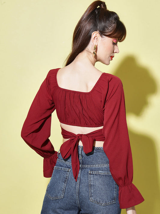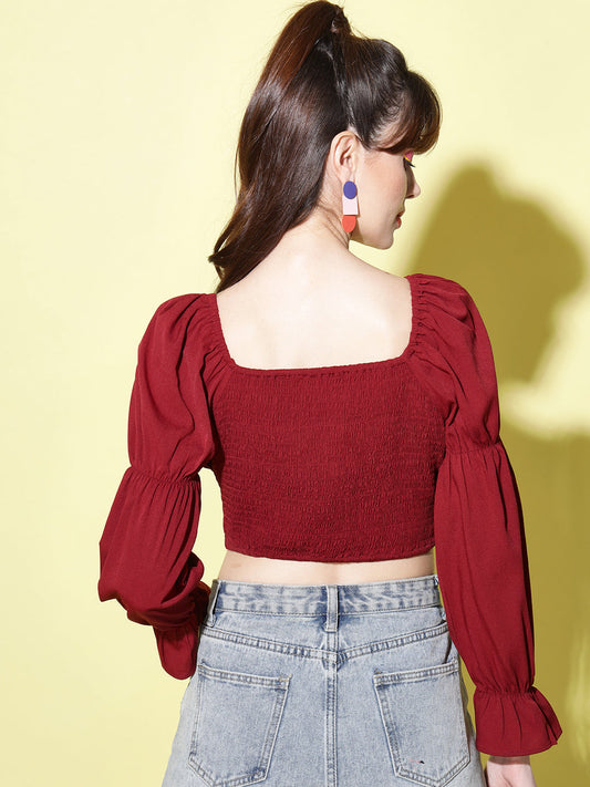 Maroon Tie-Up Neck Smocked Crepe Blouson Crop Top
