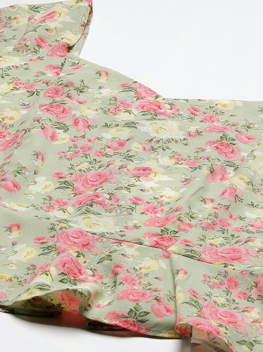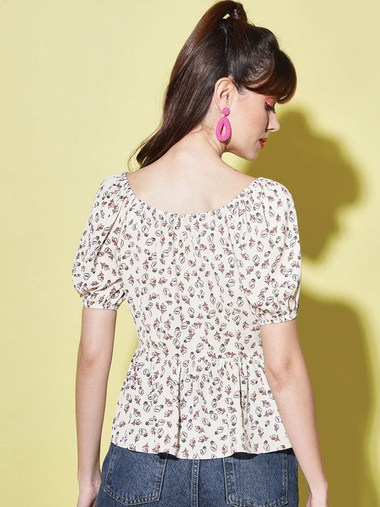 Floral Print Sweetheart Neck Puff Sleeves Georgette Peplum Top