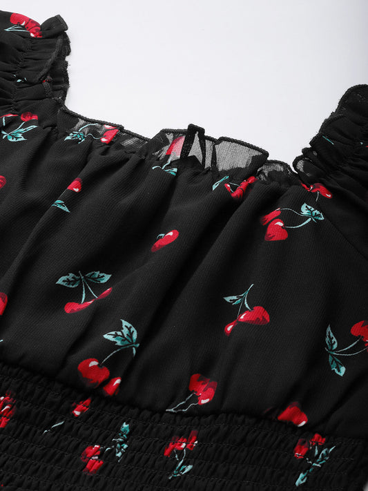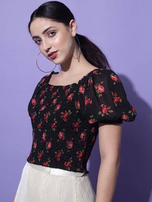 Black Print Tie-Up Neck Smocked Georgette Blouson Crop Top