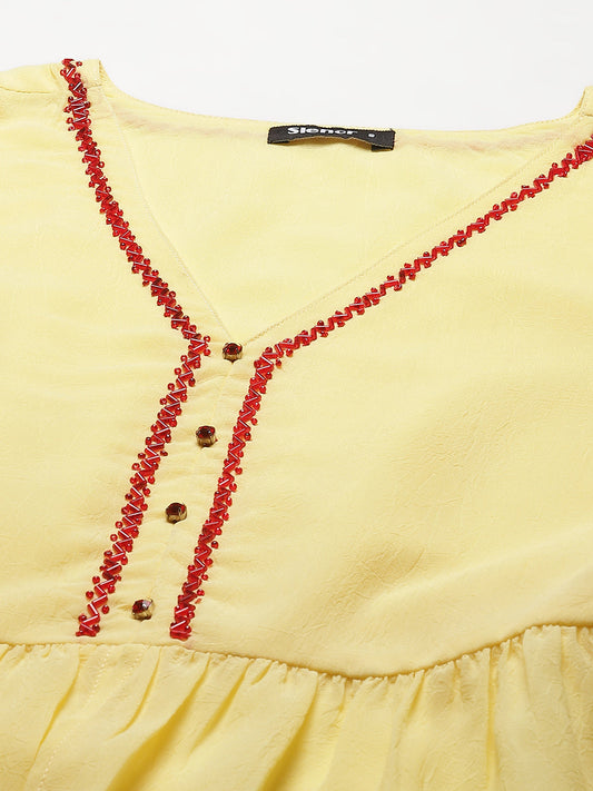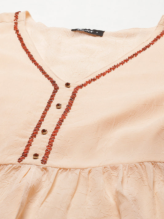Brown Solid Sweetheart Neck Puff Sleeve Crepe Peplum Top