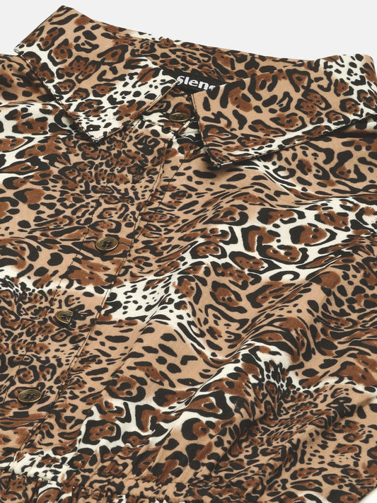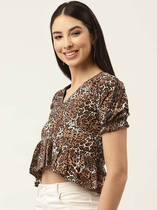 Brown & Black Animal Print Ruffles Crepe Crop Top