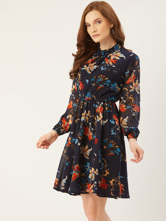 Women Navy Blue Floral Printed A-Line Dress