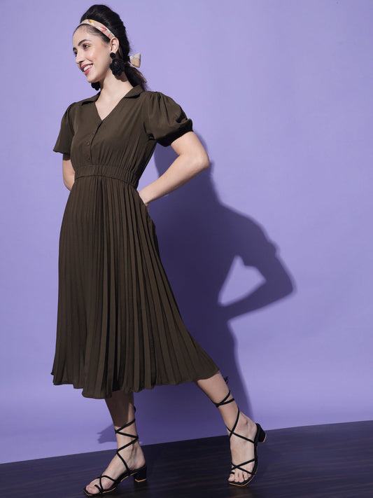 Women Olive Crepe Midi Dress.