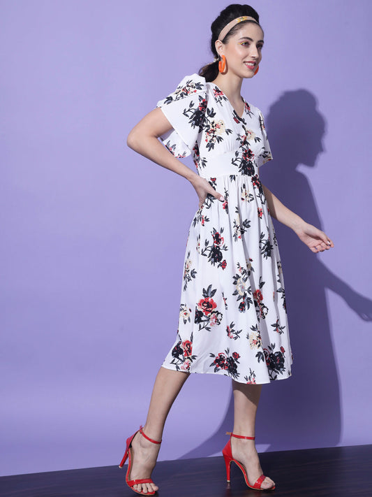 Women White & Black Floral Georgette Midi Dress