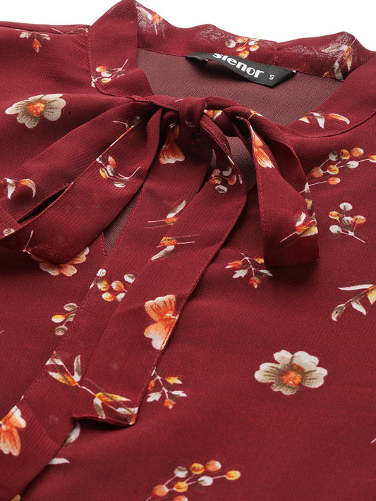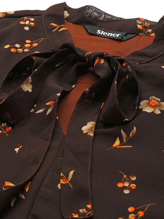 Floral Print Puff Sleeves Tie-Up Neck Georgette A-Line Dress