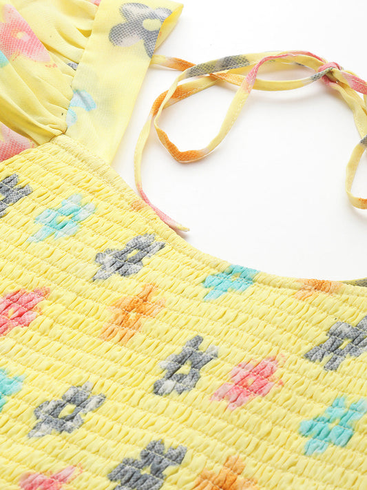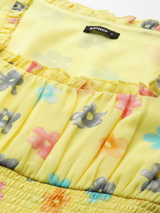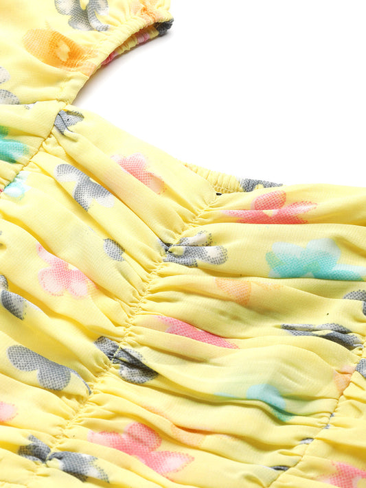 Floral Print Puff Sleeves Sweetheart Neck Georgette Mini Dress With Ruffles Detail