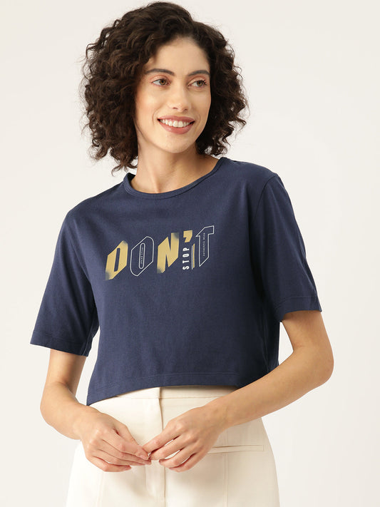Slenor Women ' s Navy Blue Typography Front & Back Printed Crop T-shirt