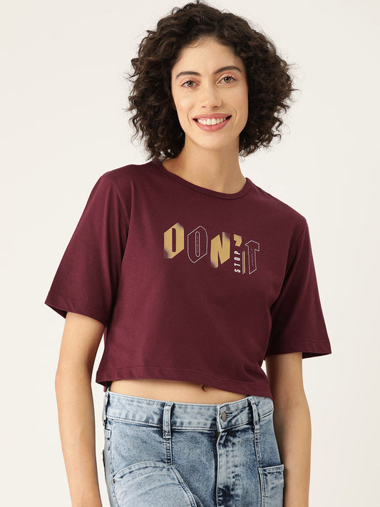 Slenor Women ' s Maroon Typography Front & Back Printed Crop T-shirt