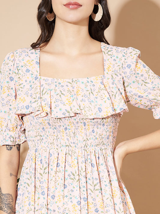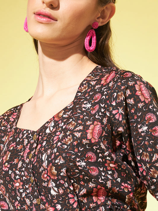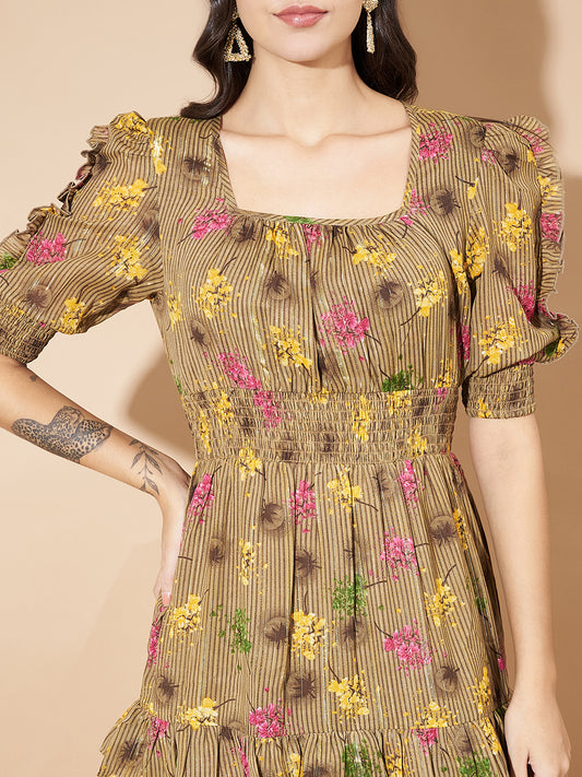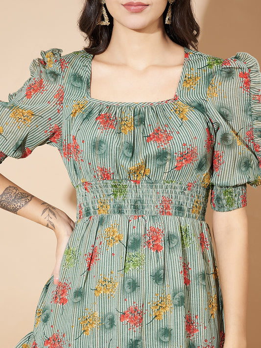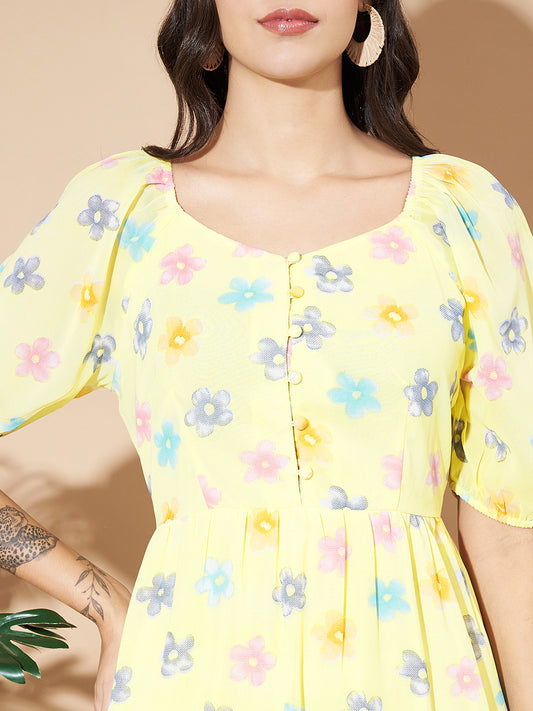 Women Floral Print Puff Sleeve Georgette A-Line Dress
