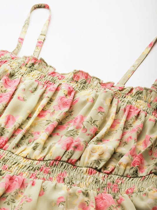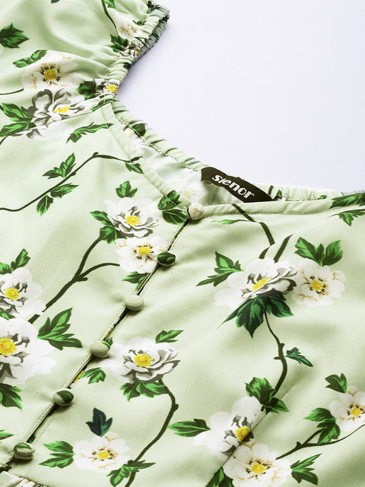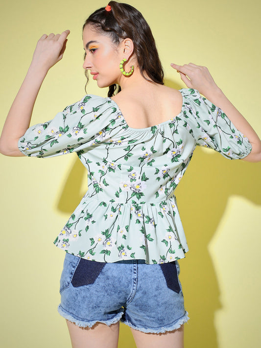 Casual Puff Sleeves Floral Print Women Green Top