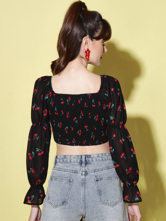Black Print Tie-Up Neck Smocked Georgette Blouson Crop Top