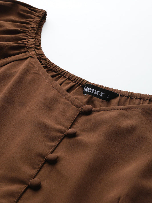 Brown Solid Sweetheart Neck Puff Sleeve Crepe Peplum Top