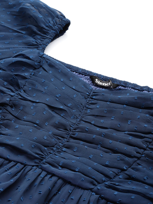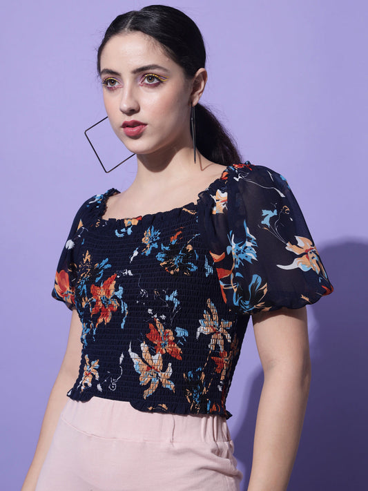 Navy Blue Floral Printed Smocking Crop Top