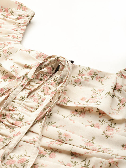 Women Floral Printed Ruched Tie-Front Crop Blouson Top