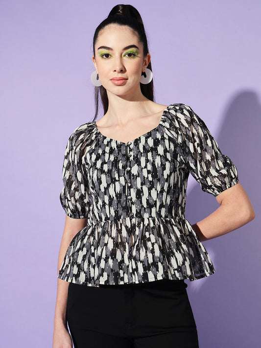Geometric Printed Puff Sleeve Georgette Peplum Top