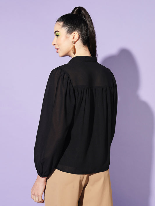 Women Black Solid Mandarin Collar Shirt Style Top