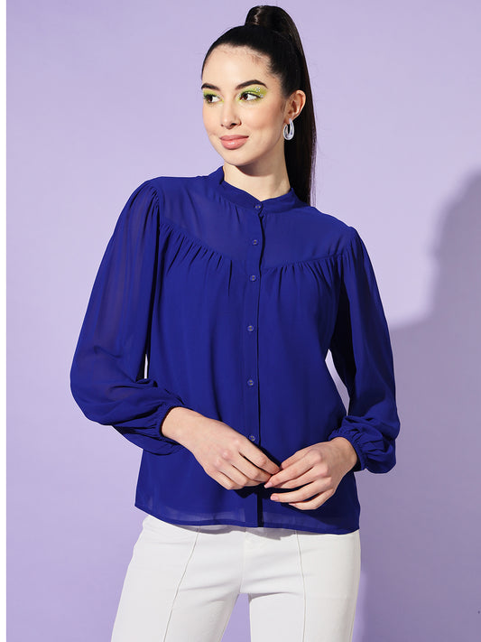 Women Blue Solid Mandarin Collar Shirt Style Top