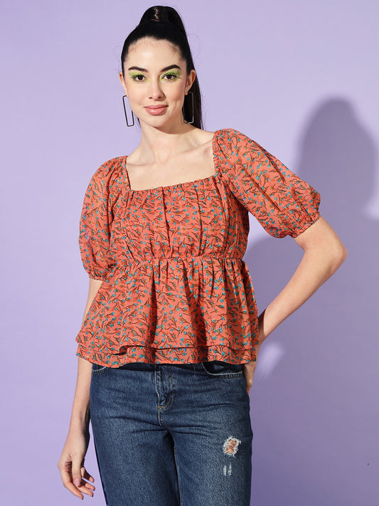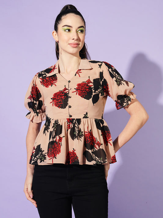 Floral Printed Puff Sleeve Georgette Peplum Top