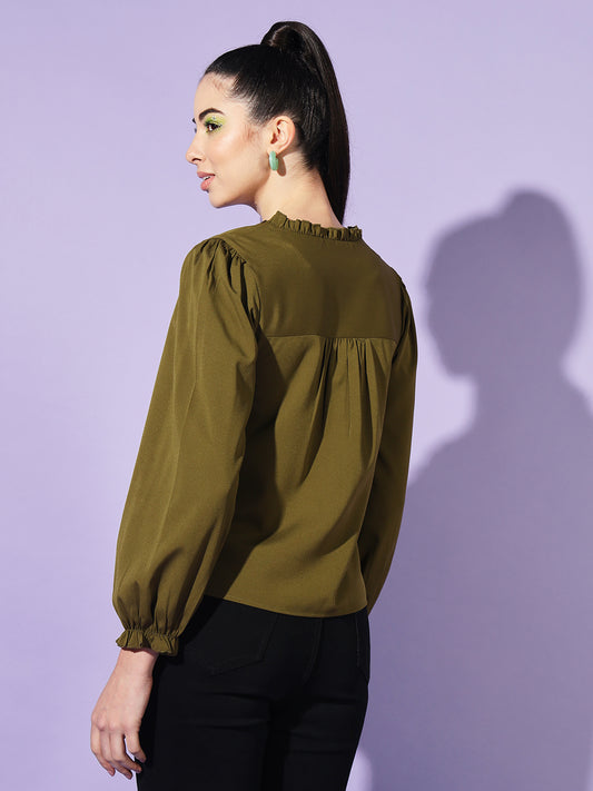 Women Olive Solid Puff Sleeves Shirt Style Top