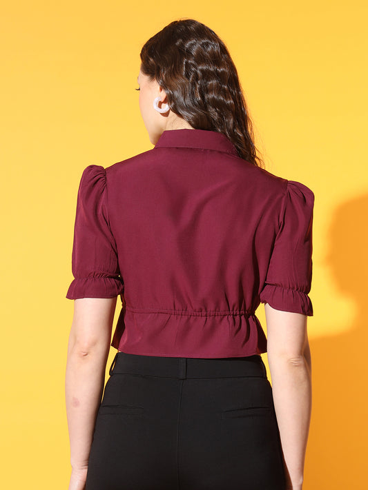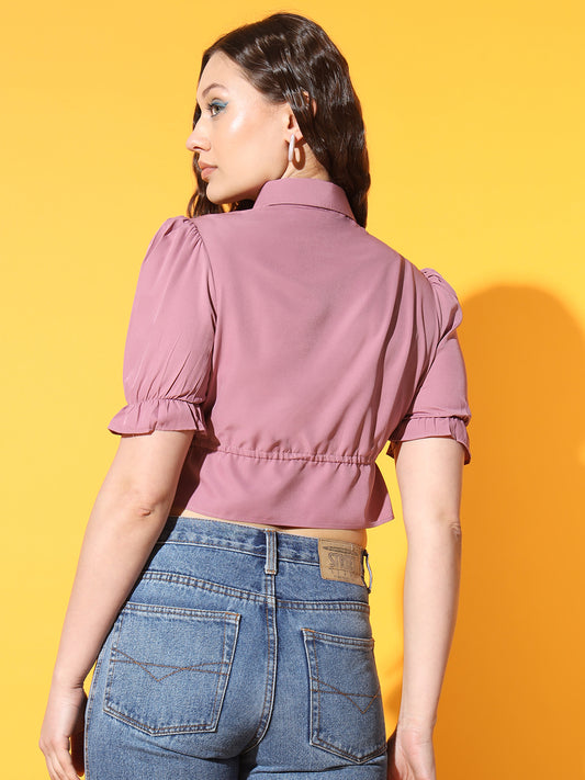 Women Purple Shirt Collar Puff Sleeve Crepe Shirt Style Crop Top