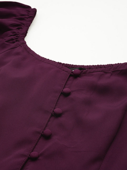 Purple Solid Sweetheart Neck Puff Sleeve Crepe Peplum Top