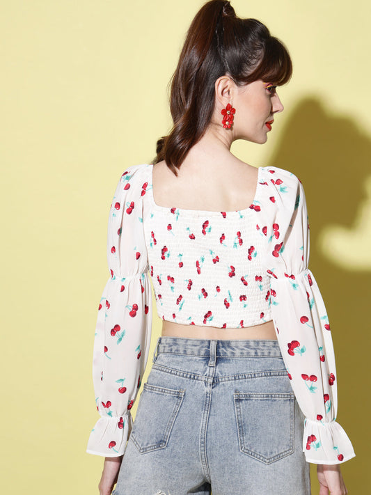 White Print Tie-Up Neck Smocked Georgette Blouson Crop Top