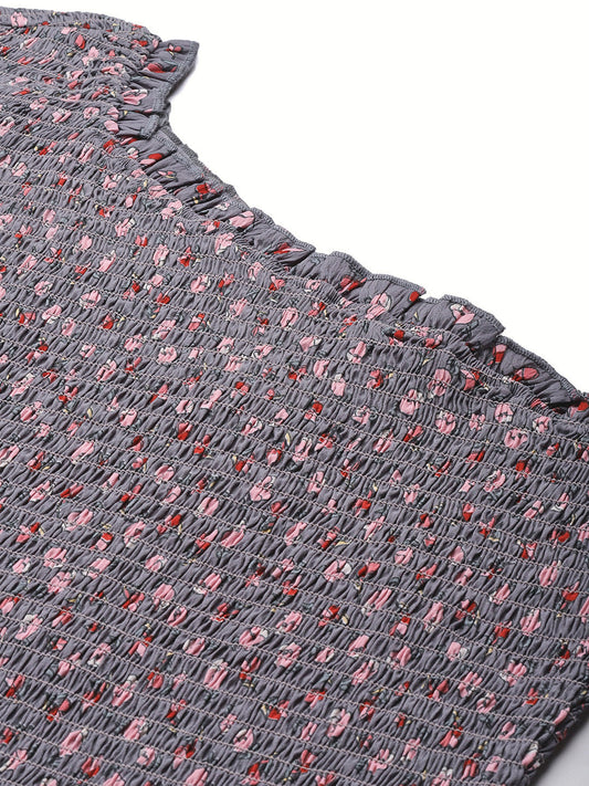 Grey Floral Print Smocked One Shoulder Crepe Top