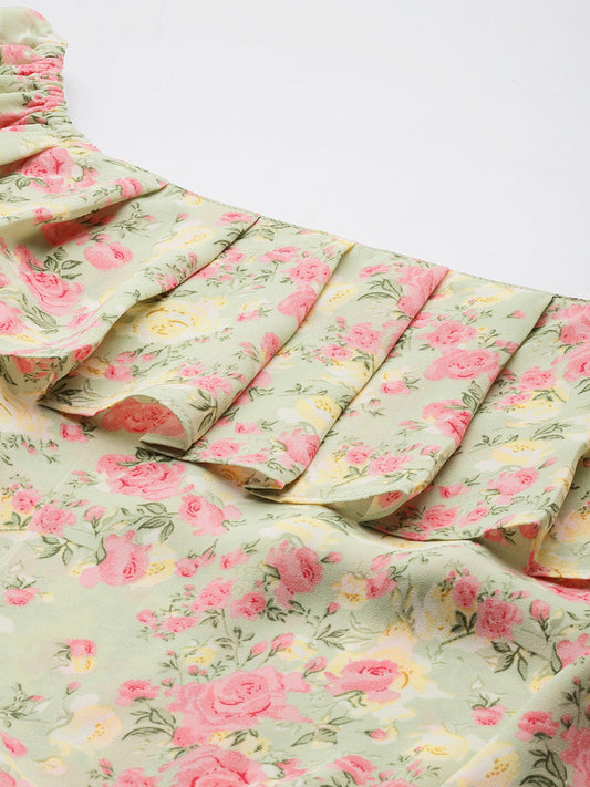 Multicoloured Floral Print Off-Shoulder Ruffles Bardot Top