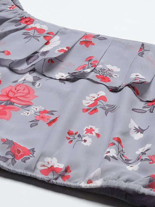 Grey Floral Print Off-Shoulder Ruffles Bardot Top