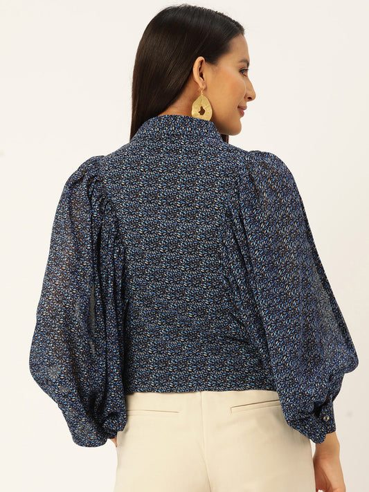 Women Floral Printed Puff Sleeves Semi Sheer Shirt